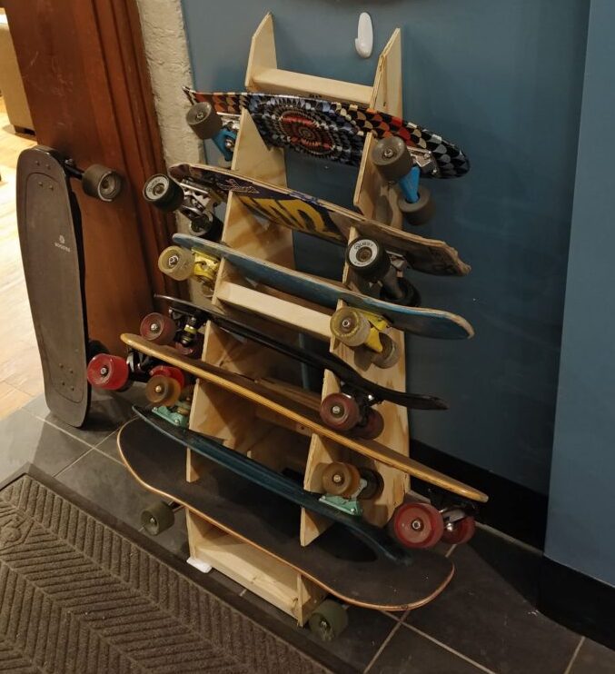 The rack ended up with a height of ~48″, which not only reduced the number of cuts that I had to make because our wood boards were already that height but also was just about the height that I needed to comfortably fit 7 skateboards in.