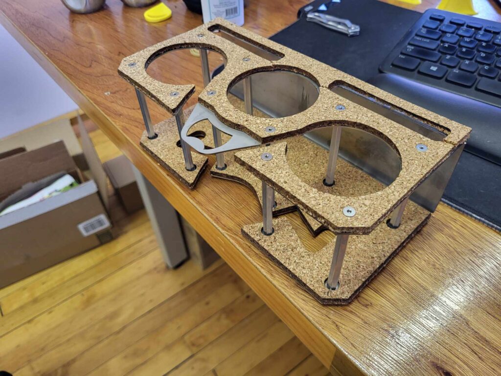 Upon assembling the cupholder, I discovered an issue with the design that I had missed. The standoffs were bolted through a layer of cork, making them less stable and more prone to being at weird angles. To solve this, I cut out small plastic spacers the same height as the cork and placed one under each standoff. I then re-cut the cork with room for these spacers.