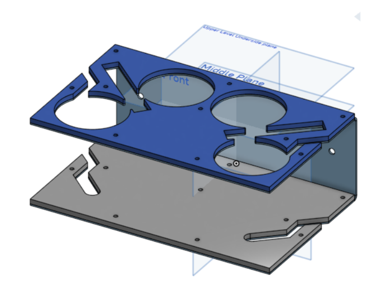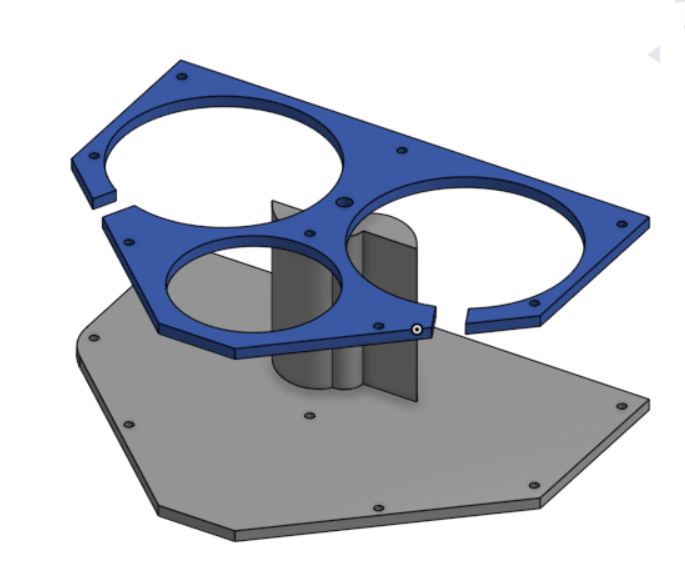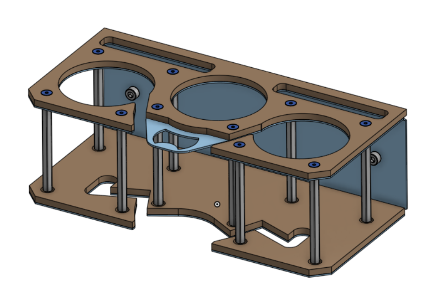 The first structural idea that I explored was keeping the bent shape of the original cupholder, so as to better fit in with the general boat aesthetics. I also liked how using a single bent piece could keep the part count down, so I decided to go with this as my structure. To rigidify the structure, I decided to put standoffs in between the two bent metal flanges, to prevent these sides from bowing and make the structure stronger, allowing me to use thinner material.