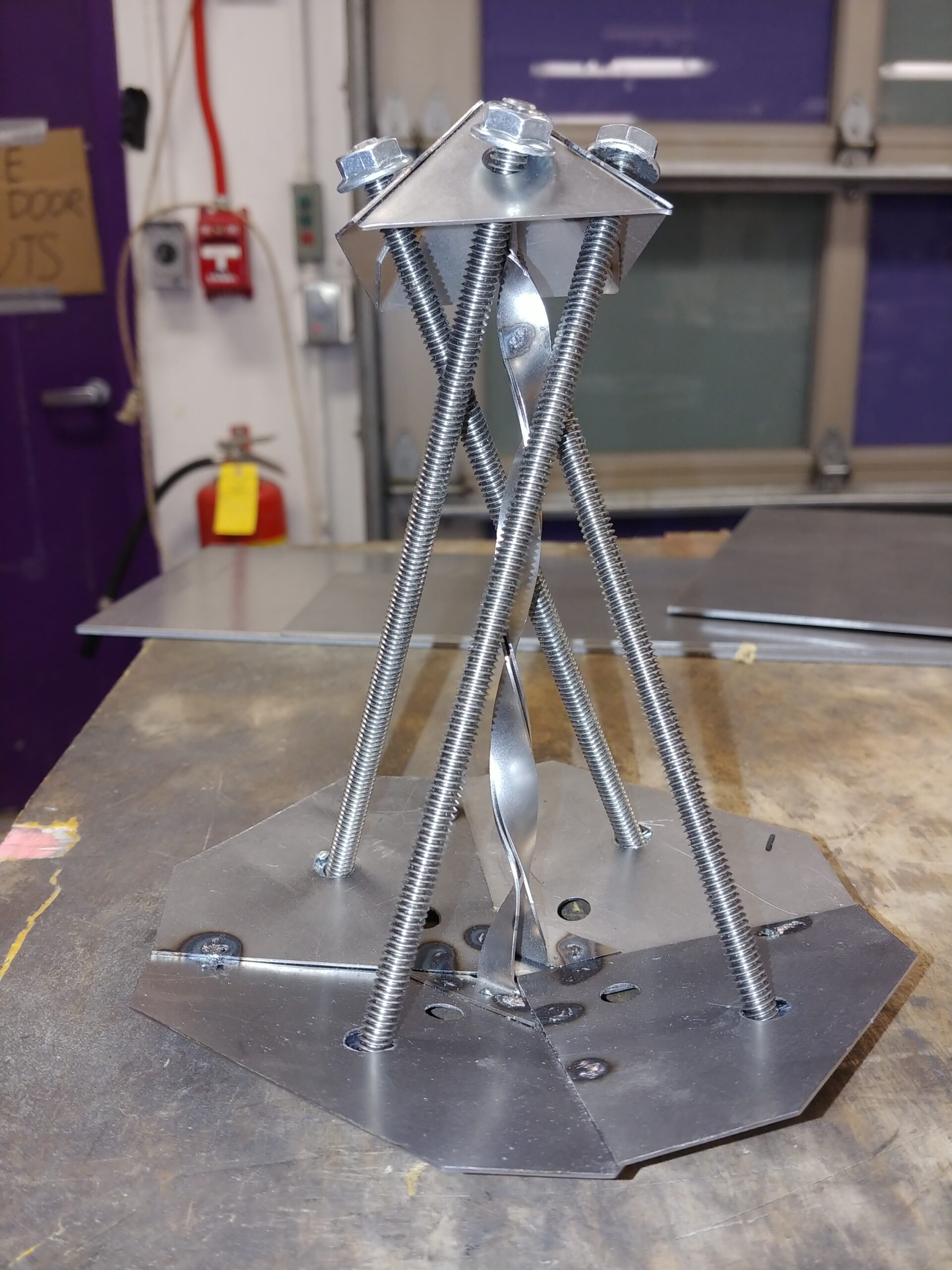 Made from bent steel, spot welded together, and stainless steel threaded rods and nuts