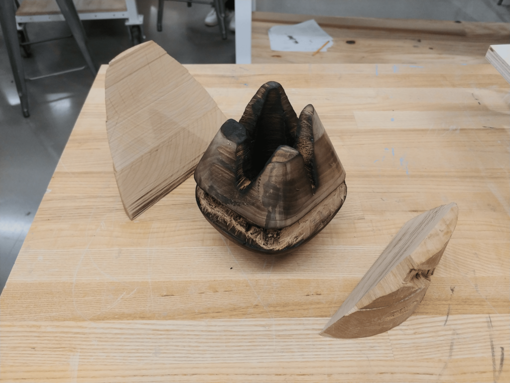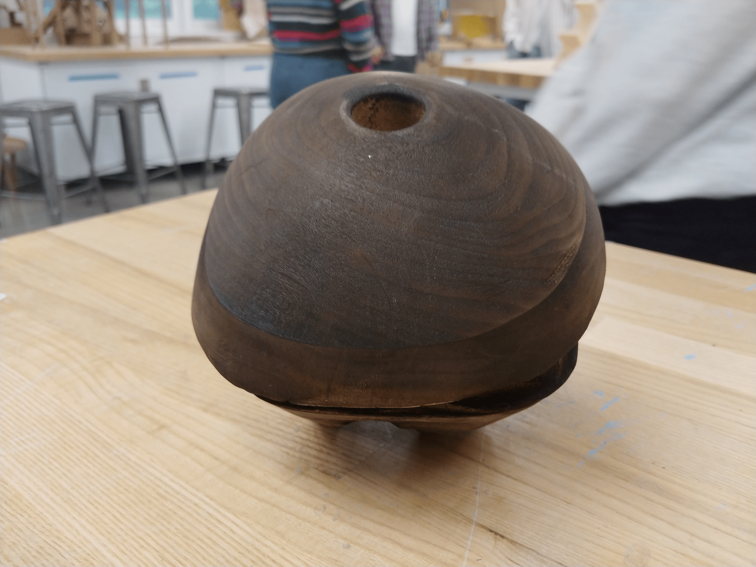 First, I glued 3 round blocks of red alder wood together, Then, I used a combination of bandsaw and power carving with an angle grinder to make the rough shape. Then, I used a chisel to form the groove around the midsection of the piece. Then, I smoothed the piece with sandpaper. Next, I used a propane torch to blacken some sections, including the bulbous end, where I alternated with the torch and sandpaper to achieve an interesting “soft” finish
