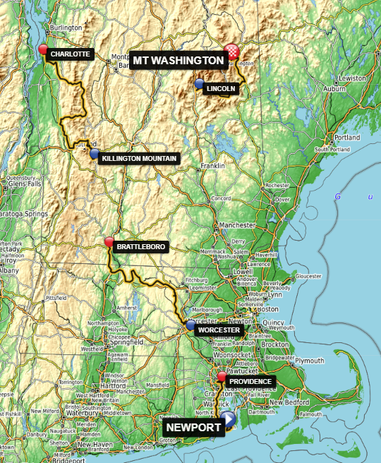 This is my design of the route for a hypothetical cycling race taking place in New England. All the GPX files are at the bottom of the article, and each stage contains a link to the La-Flamme-Rogue profile