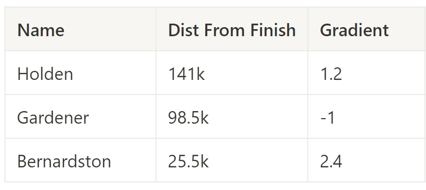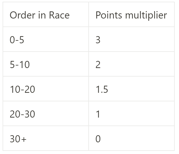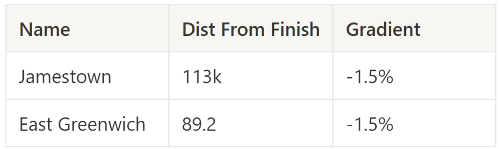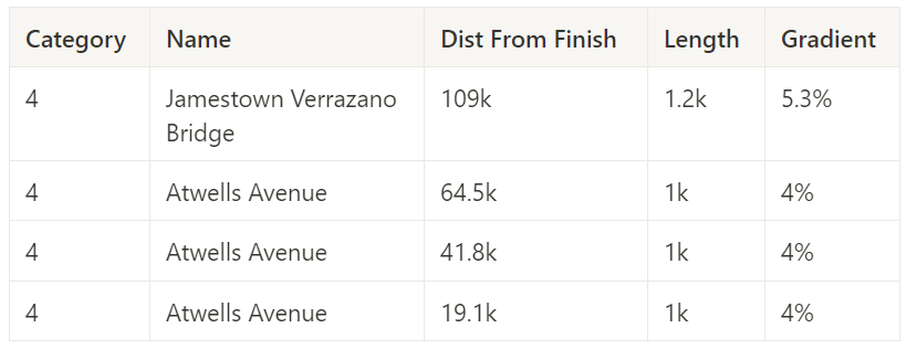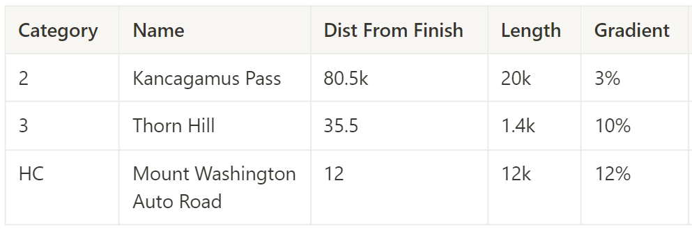 Scoring: A competition unique to the Tour of NE. At each climb, there will be a timing gate at the bottom and the top. For every climb, the 20 fastest riders on that segment will receive points (1-20), which will then be multiplied by a factor based on their order within the race at the top of the climb. All climbs count for this competition equally.