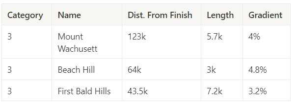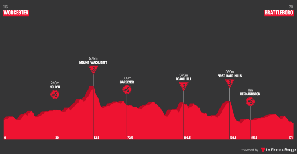 Starting in the industrial city of Worcester, this stage will have chances for a breakaway, but if teams can work together a sprint is likely. Leaving Worcester, the race heads into the hills northwest, featuring 3 category 3 climbs where new leaders in the KOM and Punch jerseys could be crowned. Crossing into the state of Vermont, the race will get a first introduction to the charm of the small towns of northern New England. The finish in Brattleboro will be a fast one slightly downhill in the lead-up to the final kilometer.