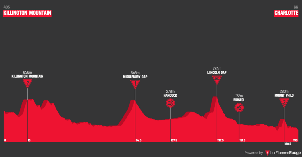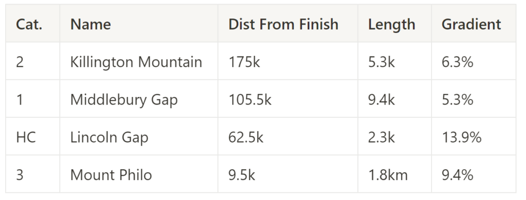 The Queen stage. The riders will be immersed in the majesty of fall in New England as the race cruelly has the riders crisscross back and forth across the green mountains. However, many riders may not have time to admire the scenery as they fight across 4 categorized climbs, including one of the steepest paved miles in the continental US, the Lincoln Gap, where the last 2.5km is at 16-18% sustained gradient. No climb on this stage is over 8km, but many are steep and offer opportunities for breakaway and GC riders to split the race. Additionally, the 2 long valleys in between the climbs should incentivize GC teams to send helpers into the breakaway. The finish is 5km after the final kicker(Mt. Philo) giving any riders who have energy remaining a place to make the decisive move.