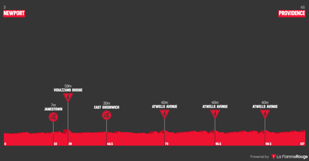 To start the race off, riders will leave from scenic Newport, rolling past Gilded Age mansions, huge yachts, and the Tennis Hall of Fame. They will then pass over Narragansett Bay via two bridges, taking a detour in the middle for an intermediate sprint.