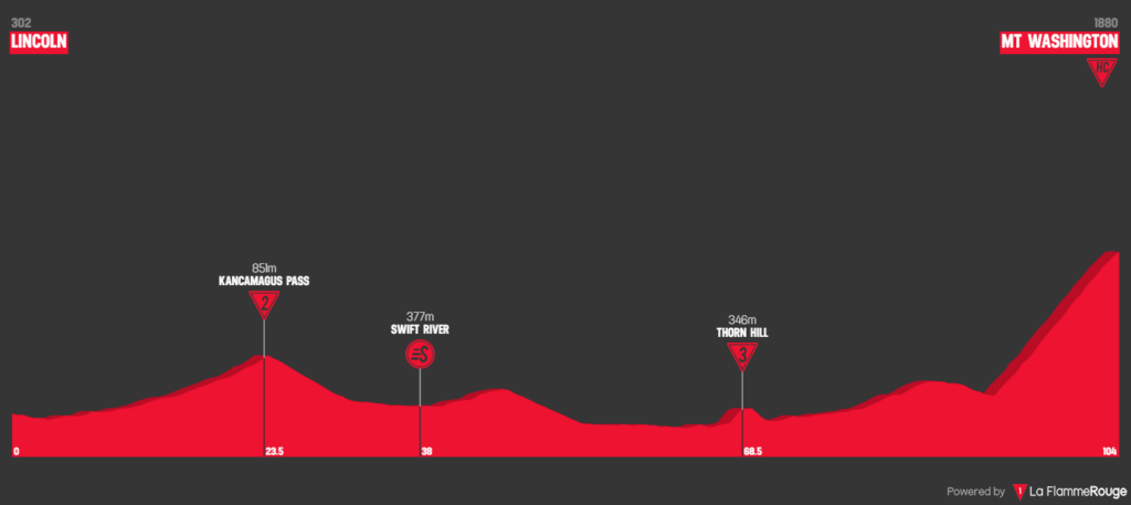 While this stage is not the Queen stage, it will also be a brutal test. We leave the Green Mountains of stage 3 for the presidential range of the White Mountains. Starting in the ski town of Lincoln, NH, the riders will embrace their role as “leaf-peeping” tourists and follow the Kancamagus Highway east. After the category 2 hill, a long valley awaits before the uphill HC finish, which could provide opportunities for GC contenders with teammates to split the race on the first climb and use their domestiques on the valley afterward. This stage features an uphill finish to Mount Washington, the highest peak east of the Mississippi and once the location of the highest wind speed on earth(372 km/h!!). Over eons, the ripping winds have turned this mountain into a perfect slope-with a steady gradient of 12km at 12%, finishing at 2000 meters, there will be nowhere to hide. With the tough climb and 10/6/4 bonus seconds up for grabs the general classification should be decided on this climb. If the right riders show up to this race, there is little chance of the breakaway winning outright, but clever outside favorites and mountain domestiques will try to go with the break to get a headstart on the main contenders.