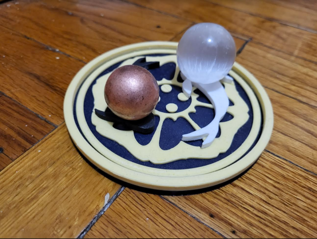 I went to a local rock shop in Chicago and came back with some awesome spherical polished rocks, one copper and one quartz. However, I didn’t have a good way to store them on my desk because they would roll off. So, I set out to design something to hold them on my desk. Drawing on the imagery of the moon and ocean spirits from the TV show Avatar: The Last Airbender, I created a design with the two fish spirits “swimming” above the white lotus image, another image from the series. To achieve a bold look, I printed the base out of two different filaments, swapping colors halfway through the print to make it so the raised edges of the base piece stood out from the background. I then printed the two fish spirits, one in white and one in black, and snapped them into place on the background.